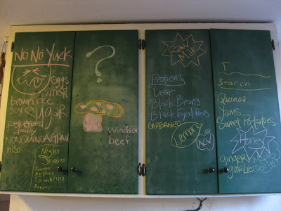 So here we are Spring 2010. His eczema can be off the charts, his allergies still questionable, his tummy bloat really bothering him… and looming fatherhood on the horizon. I think the baby arriving in a couple of months has been a huge impetus for him to take care of the things in his control like his diet. So he has returned to the idea of clean eating and elimination dieting. He slowly worked on weaning himself off coffee and sugar for about 2 weeks to avoid the fetal position couch monster he was last year. Then he began his clean eating program. We used our chalkboard cabinets to divide foods into no, maybe, and yes categories based primarily on The New Detox Diet again.