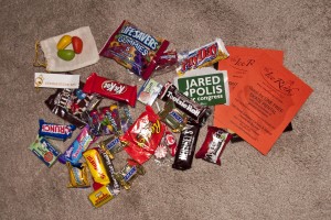 First off, I moved to a new domain. I jumped the gun early and should hopefully have time to get to it this week. We’ll see, I’m not freaking out over it. Second, yesterday was Halloween. We went to the Munchkin Masquerade in downtown and there was candy and treats all over the place. A number of merchants signed up to do “green” treats this year. The little colored pebbles in the top corner of the loot picture are soy crayon rocks from clementine art. I thought those were cool. We picked up about 20% of the candy and treats available to us. My goodness can a kid clean up out there. I suppose this is when I am glad I have a sugar cane allergy because I can’t go near most of this stuff.