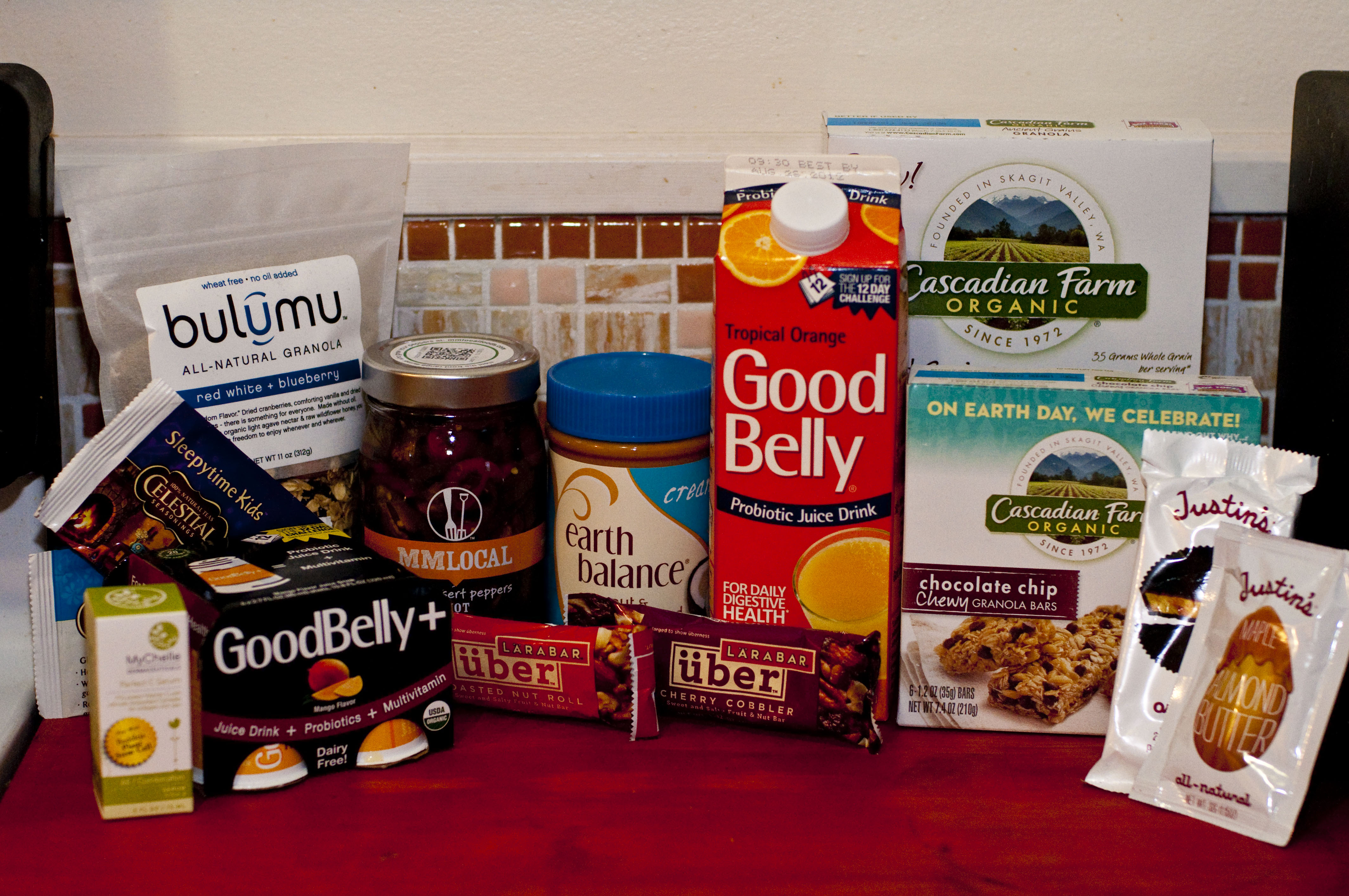 I sent my husband off to work with the granola and cereals pictured above. However he has to eat those soon because due to some news he got recently he has to go on a very restricted diet for a while. I’ll talk more about that in another post in the near future. For now enjoy Boogs. I love Celestial Seasonings and enjoy their cafeteria at least once a month. I have some myChelle products and am still deciding how much I like them for me. mmLocal – enough said, canned goods. I LOVE LARABAR – readers of my blog know this. We are a big Justin’s Nut Butter house – the individual packets are a go-to travel joy for my son (we do grind our own at the store for other use). I am also a fangirl of Gaiam (and have also chowed at their cafeteria too) – see their site for a free 10-day trial for Gaiam TV. My husband loves Cascadian Farm cereals and bars. The Earth Balance coconut and peanut butter spread will be new to me. The bulumu granola new to my husband.